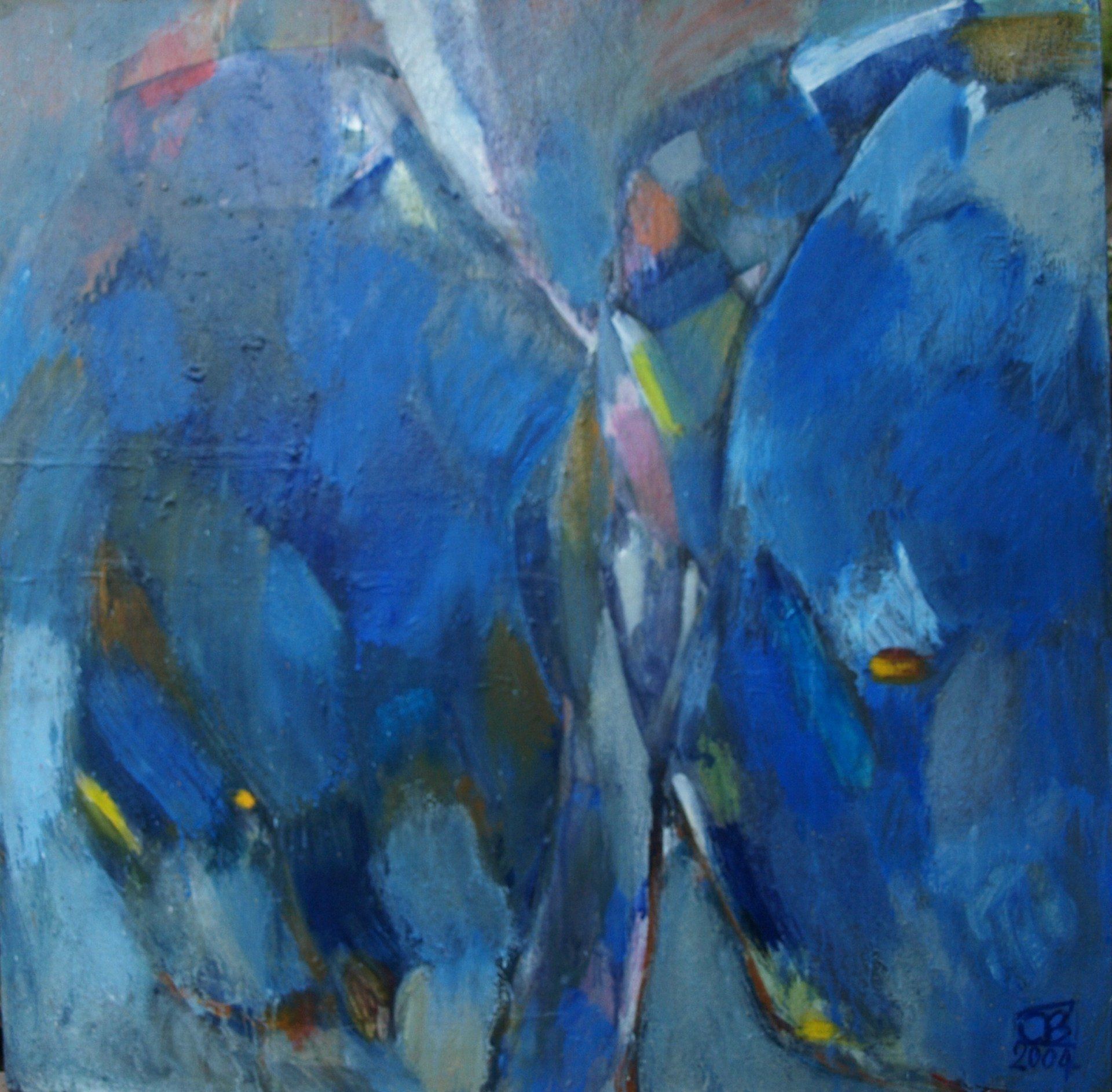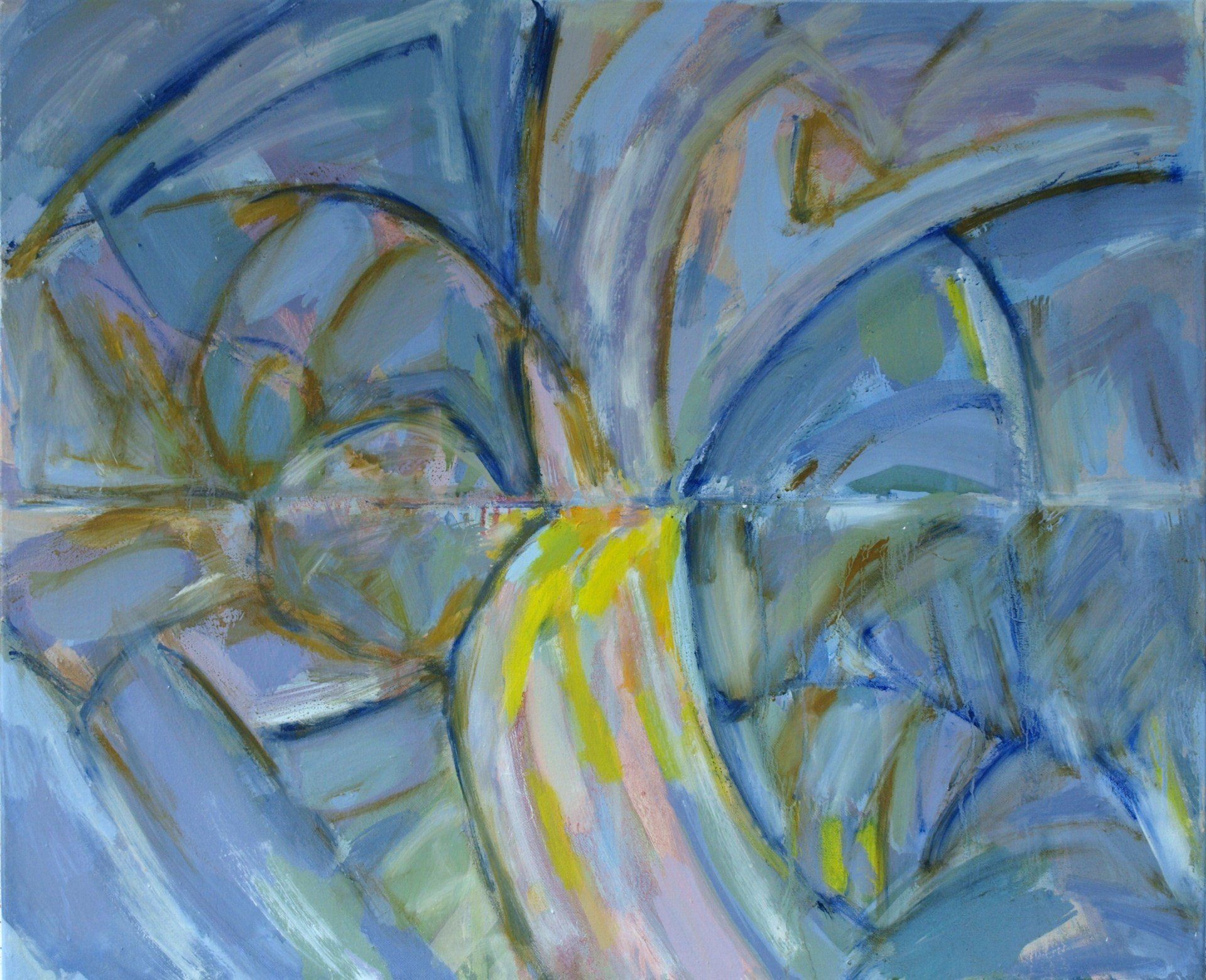 When you cut an apple in half and look inside it you’ve got the outside bit, the tension, the pips in the middle. I started painting, using blue, nothing to do with an apple, maybe more like a butterfly in form. This continued with trying with new colours and textures sticking with what felt right.