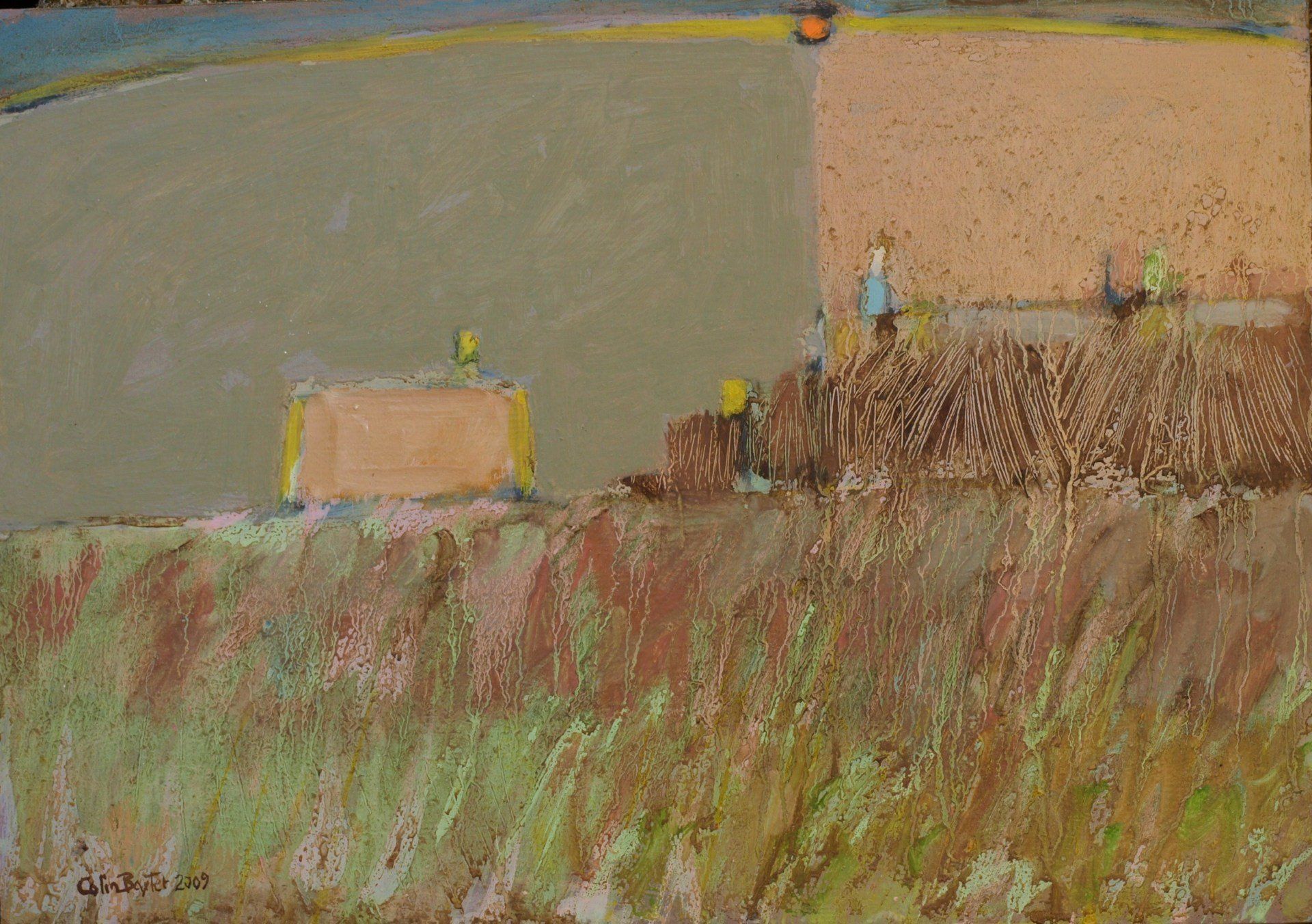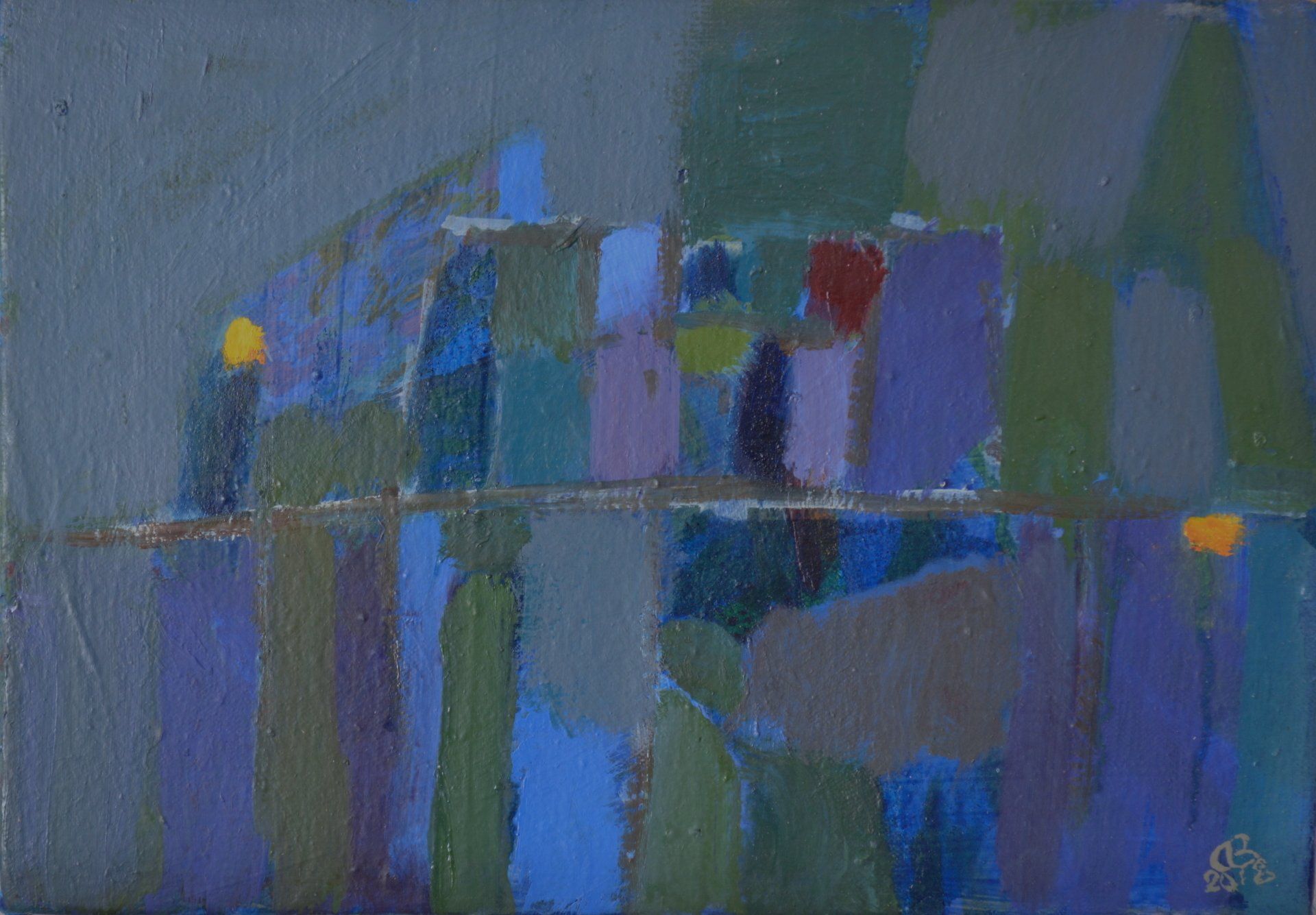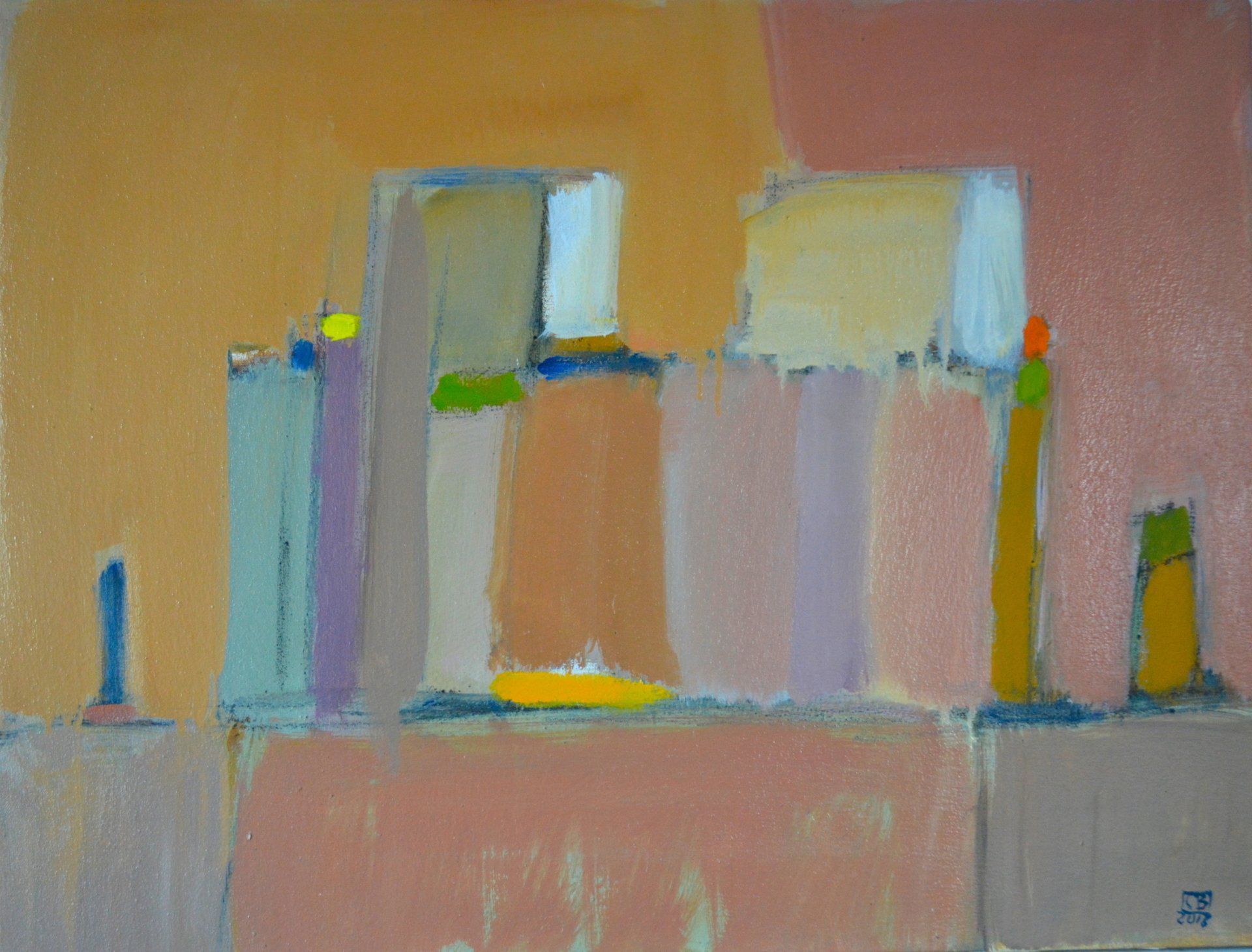 Then, years later I began to do a painting with simple blocks of colour, very similar to the original. In these later paintings there is an introduction of a horizontal line i.e. the horizon. The sense of a landscape by the locks of colour were the only things in the painting and I began to realise that once you limit yourself to just a scenario of a number of blocks then you could really start to play with the colours and see what they did to each other. Within the little area of the canvass I gradually realised that the moods and tensions were set up by these blocks of colour and their positions.