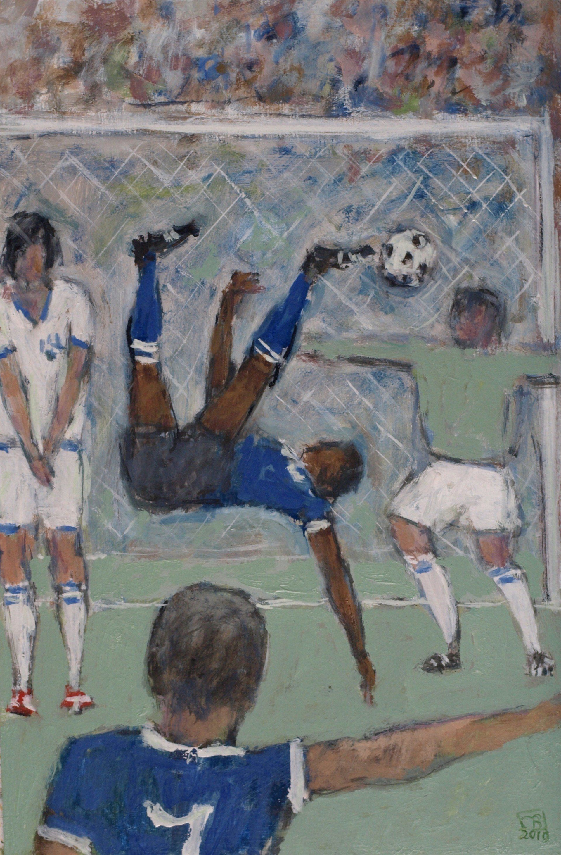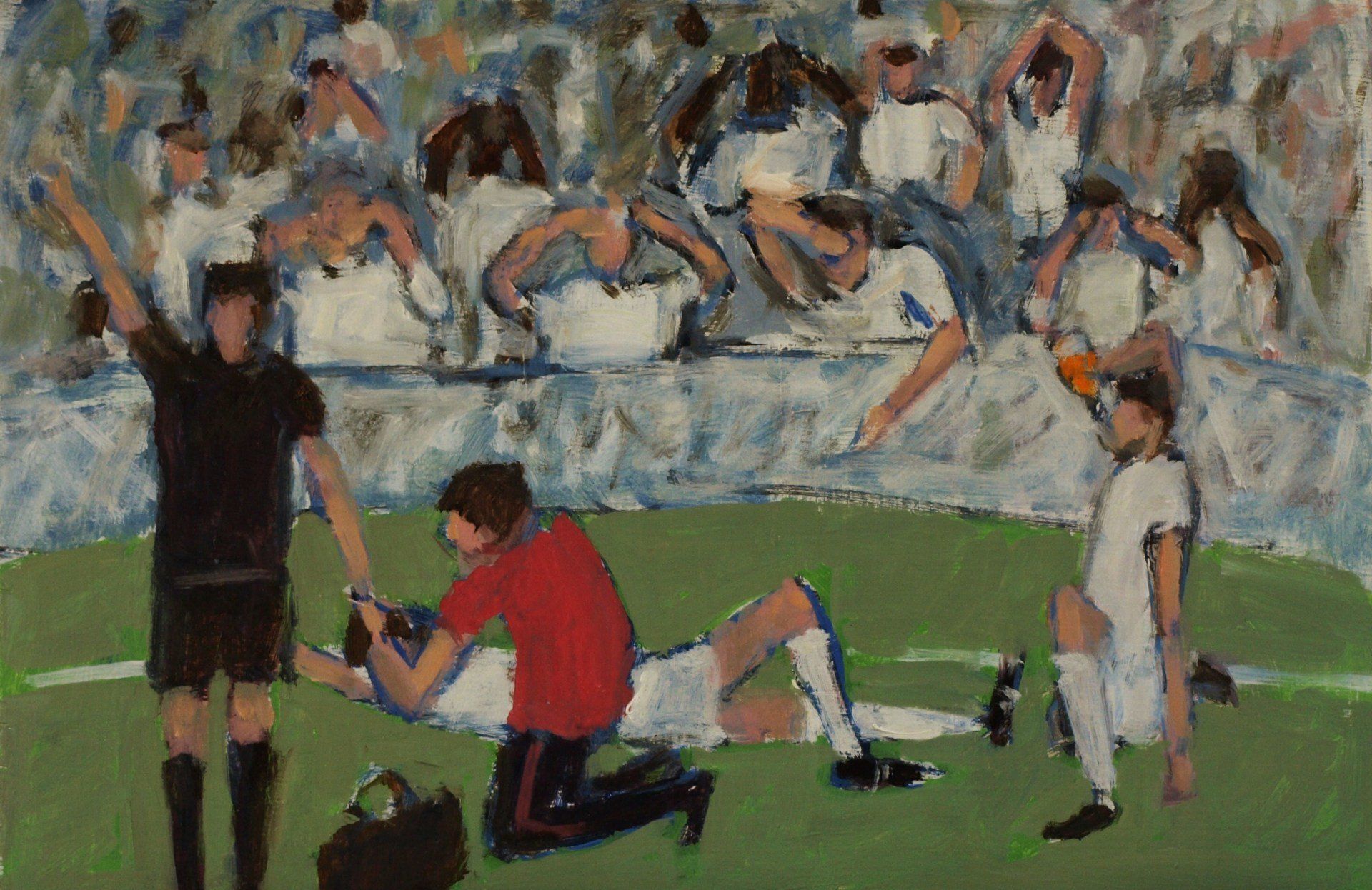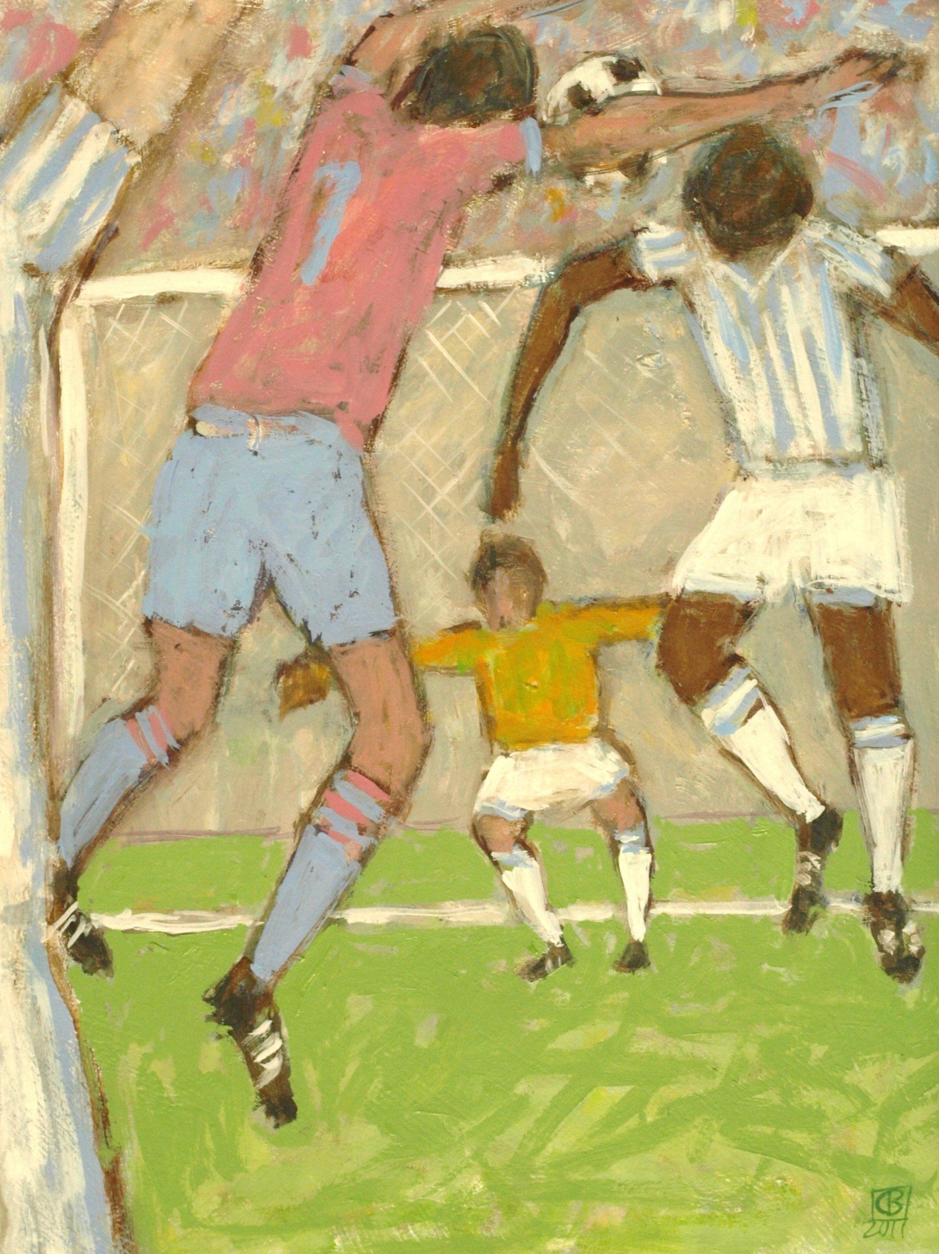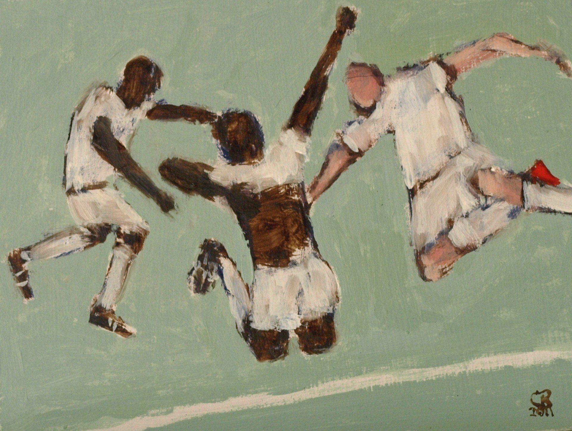 This is a funny one. I know there are people who do not like football and will find this ridiculous but people who do like football may be amused. I used to play football a lot. We have two teams with two colours on a back ground, providing a limited colour scheme. They are figures and representative but there’s no attempt to go into great detail. Like the figures by the river, these footballers have an effect on one another, their stance, the colours they are wearing and their movements on a background.