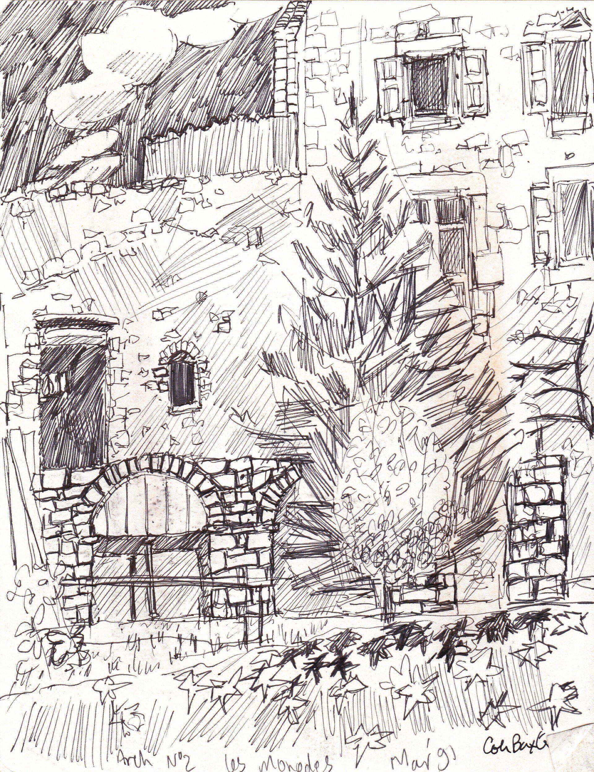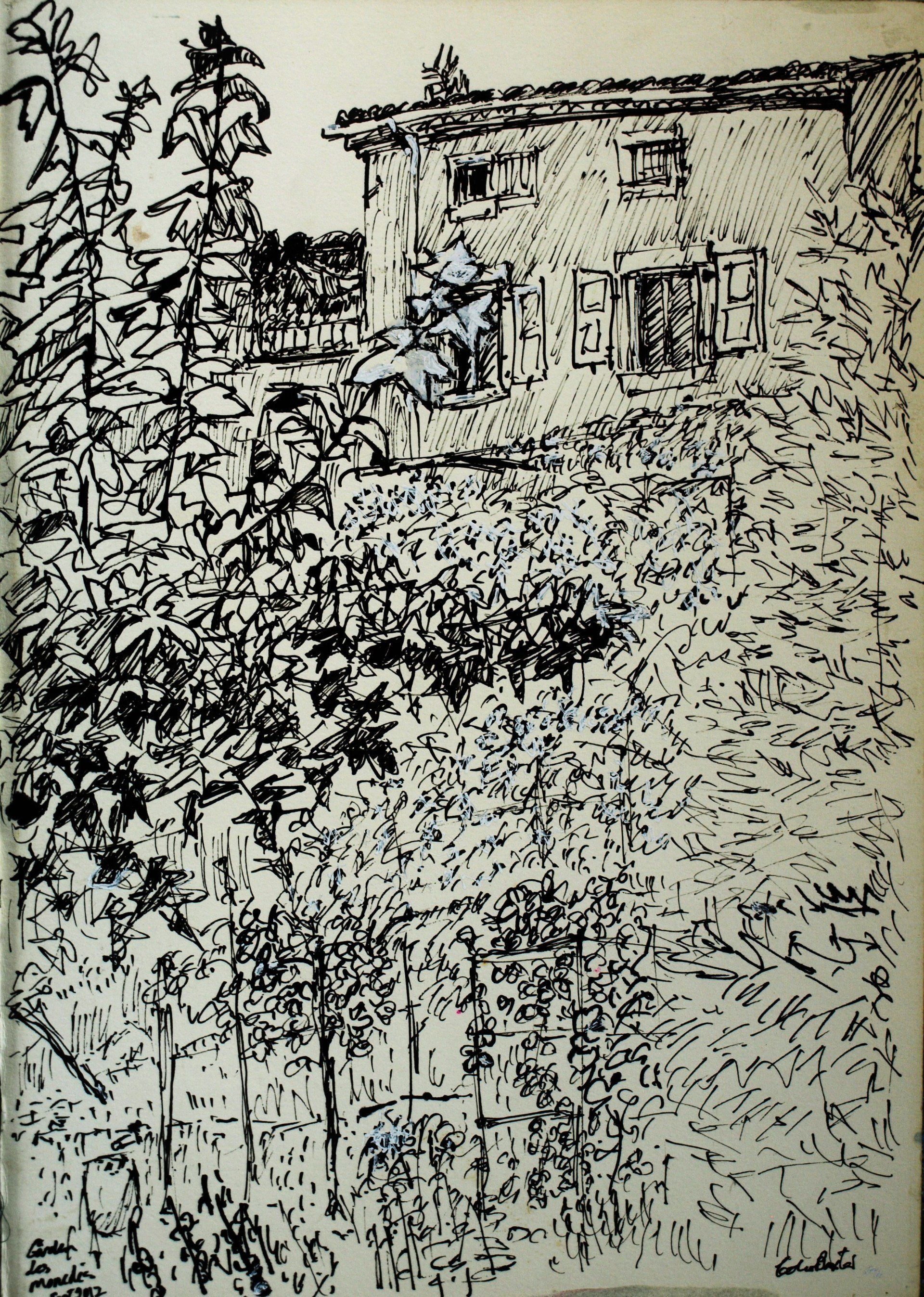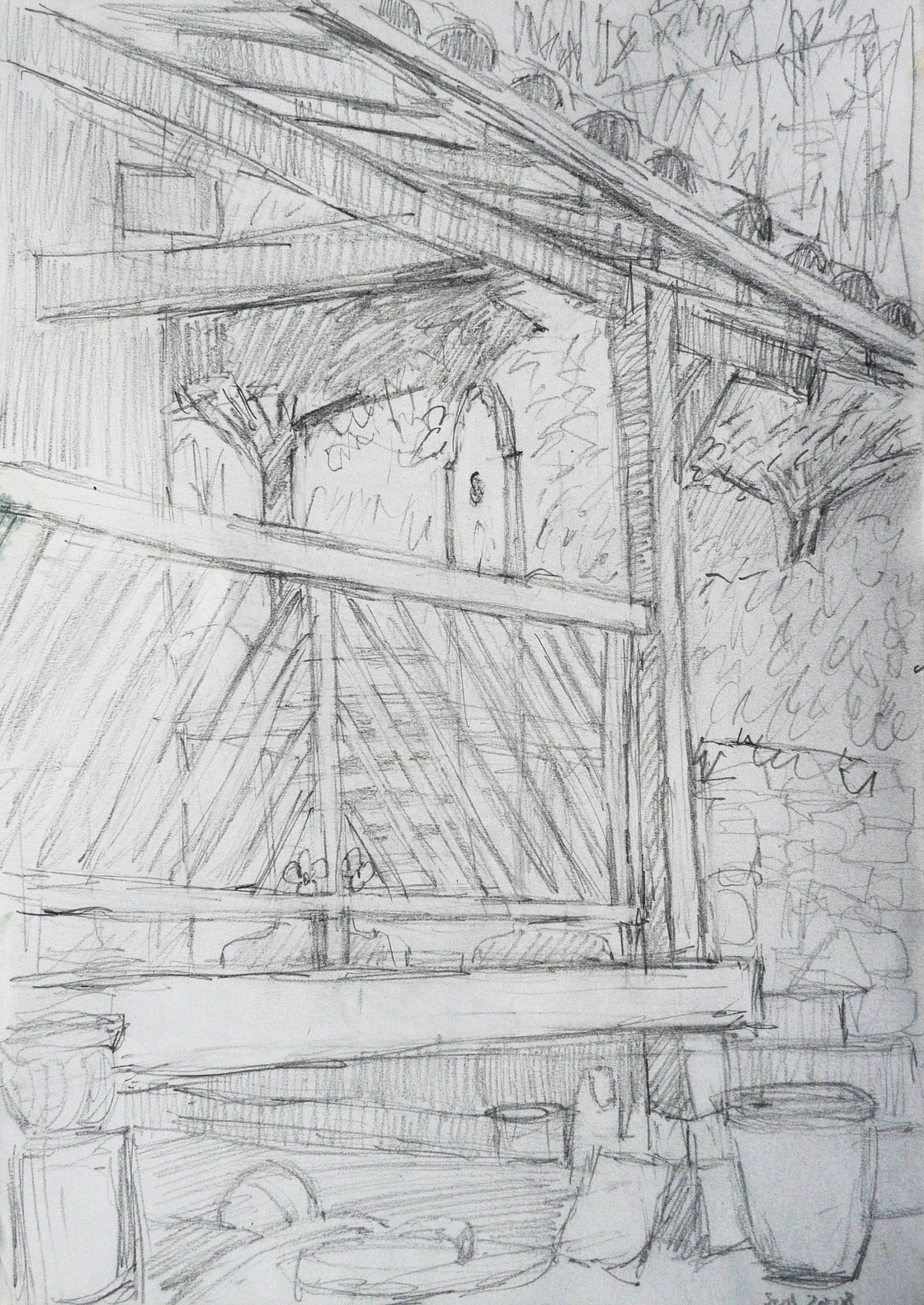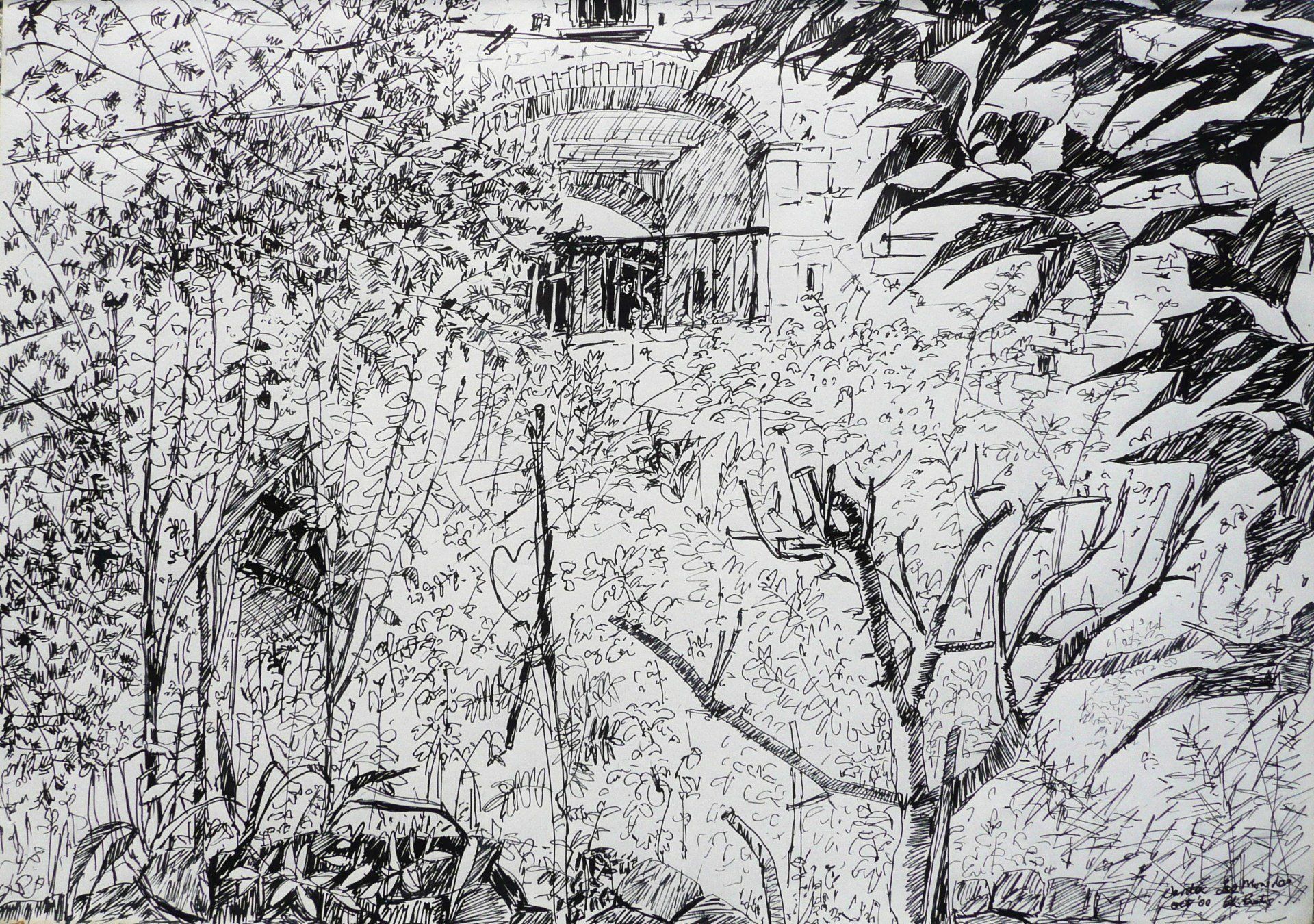 This selection of drawings and paintings is seeing and reacting to familiar surroundings. The old buildings nestle in the landscape. The garden is nature adjusted a little but always trying to revert back to the wild. It is this closeness to nature that I like and that i have a slight hand in it.