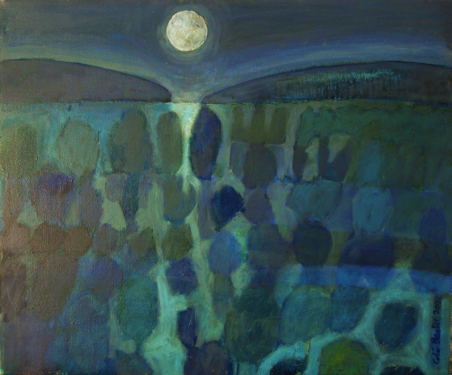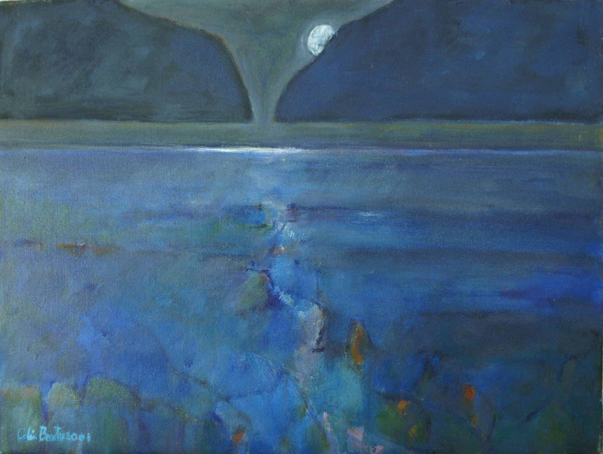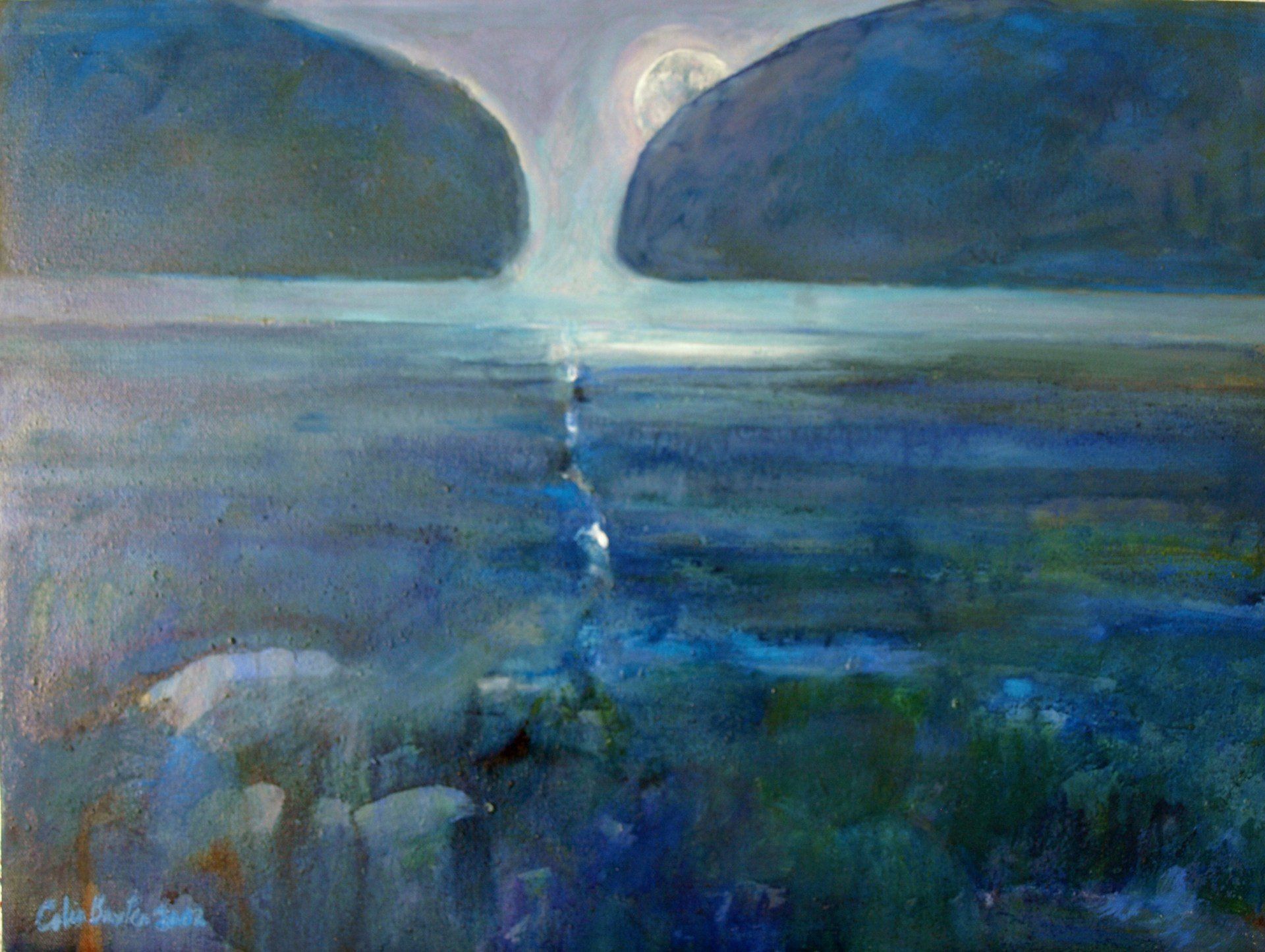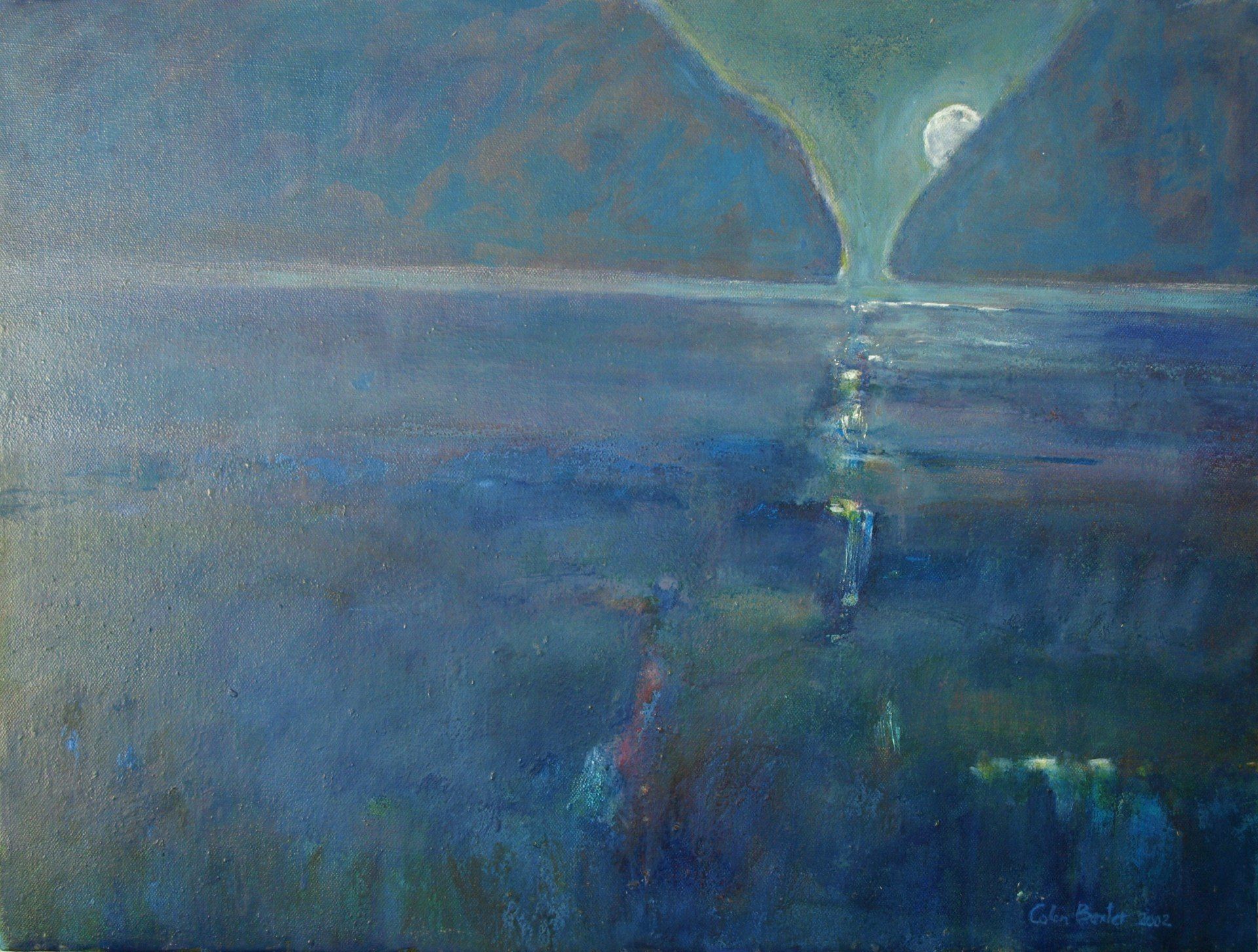 These originated from a visit to the fiords in Norway and being told that the steep mountains go just as deep again into the water, making the dark water ominously deep. Seeing this with the moon between the slopes added more to the menace. To make it seem more unreal I allowed the light which came through the gap to go under the mountains, cutting them off as if to cheat you into thinking the water shallow. Or the mountains are floating like clouds!!