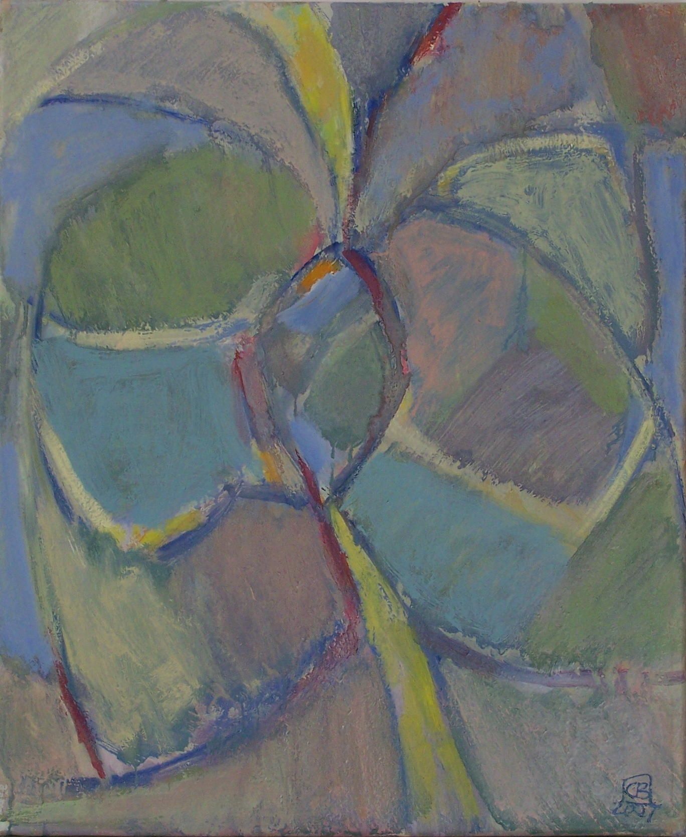 I was moving miles away from the original idea, hence the later ones called “After the apple”. Gradually a kind of format was emerging, by using variations on this it became much freer to indulge in colour and texture. I had now moved in to a world that was very abstract and like music deals in colours and rhythms.