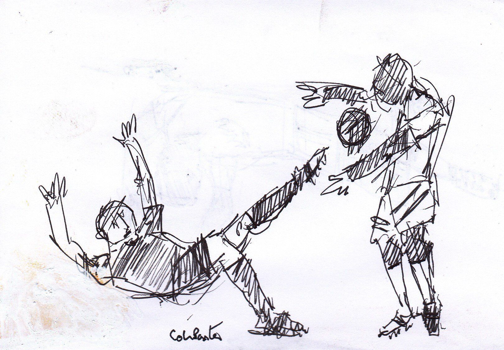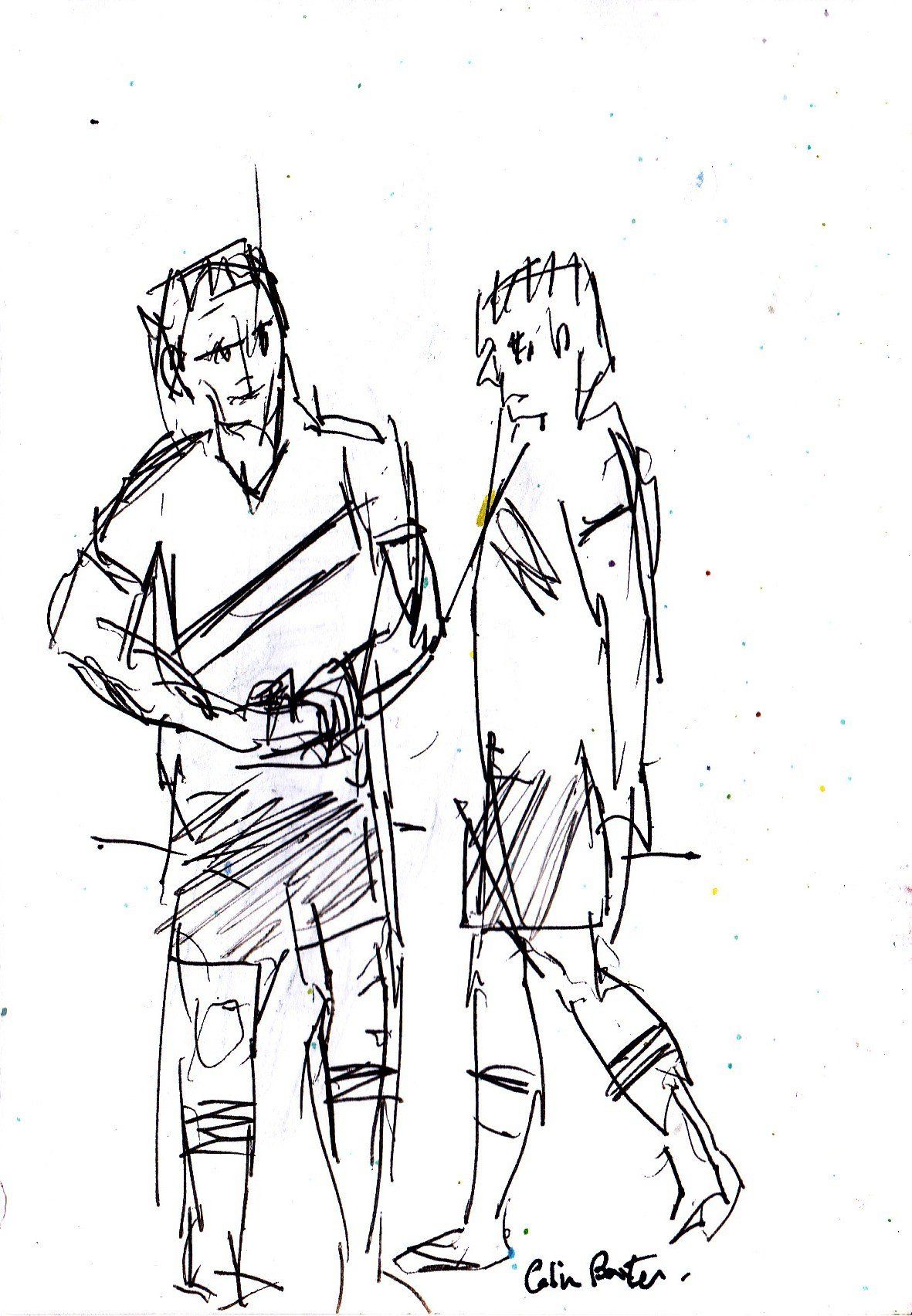 This is a funny one. I know there are people who do not like football and will find this ridiculous but people who do like football may be amused. I used to play football a lot. We have two teams with two colours on a back ground, providing a limited colour scheme. They are figures and representative but there’s no attempt to go into great detail. Like the figures by the river, these footballers have an effect on one another, their stance, the colours they are wearing and their movements on a background.